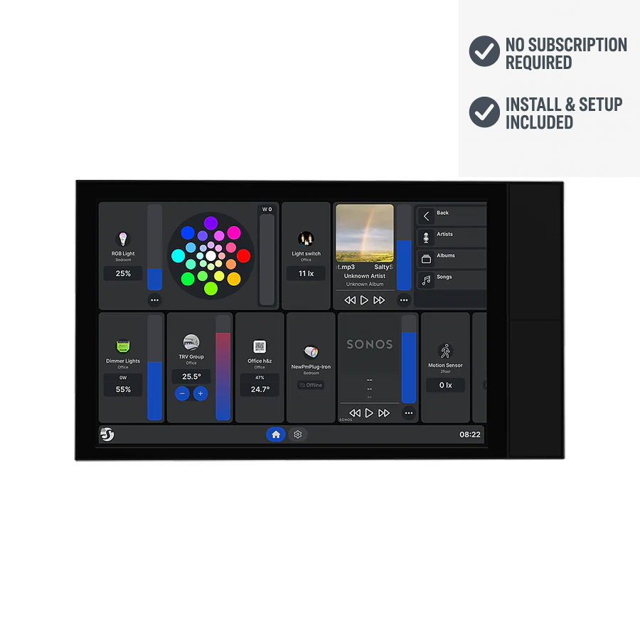 Smart home control panel with a 10.1” touch display, built-in relay switching and four customizable buttons. Installs in a standard electrical wall box and gives you full, easy control over your other devices-ideal for houses, apartments, hotels, and commercial spaces. Say goodbye to your ordinary switches – now, you can effortlessly turn your devices on/off with a simple touch. Whether it’s dimming the lights, adjusting the room’s ambiance, or ensuring optimal energy efficiency, this smart control panel makes home management simple. The highly customizable home screen becomes a reflection of your preferences, offering a quick glimpse of essential smart home details like temperature, humidity, and power consumption of the room. It also features a built-in 5 A switch, which is a breeze to operate; a quick tap with two fingers lets you switch it on or off without the need to look.