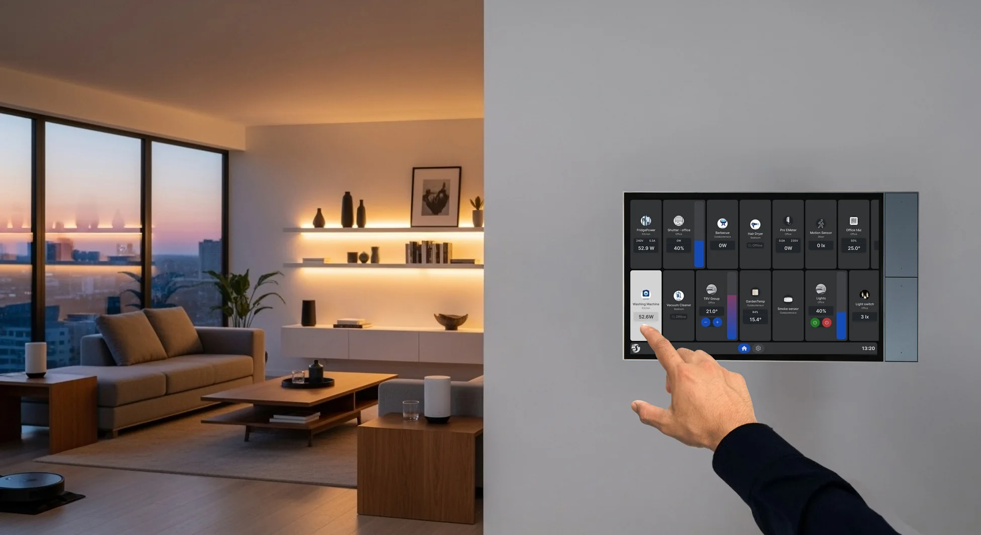 Smart home control panel with a 10.1” touch display, built-in relay switching and four customizable buttons. Installs in a standard electrical wall box and gives you full, easy control over your other devices-ideal for houses, apartments, hotels, and commercial spaces. Say goodbye to your ordinary switches – now, you can effortlessly turn your devices on/off with a simple touch. Whether it’s dimming the lights, adjusting the room’s ambiance, or ensuring optimal energy efficiency, this smart control panel makes home management simple. The highly customizable home screen becomes a reflection of your preferences, offering a quick glimpse of essential smart home details like temperature, humidity, and power consumption of the room. It also features a built-in 5 A switch, which is a breeze to operate; a quick tap with two fingers lets you switch it on or off without the need to look.